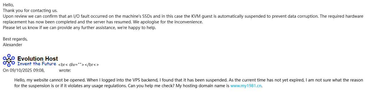 下午快4点的时候,网站突然打不开了,进入服务器发现服务器宕机,重启无效。发了邮件给技术寻求帮助以便查找原因,没想到亚历山大回信得知是服务器的SSD出现了I/O错误,已经更换了新的硬件。