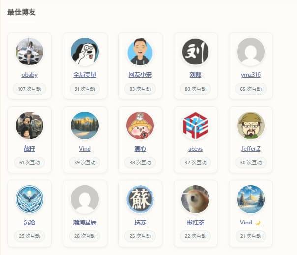增加最佳博友功能,选择不同的年份和月份,实时显示该年度和该月份互动最多博友,点击博友名称可访问博友网站;后台可控制数目,最多显示 15 位博友。